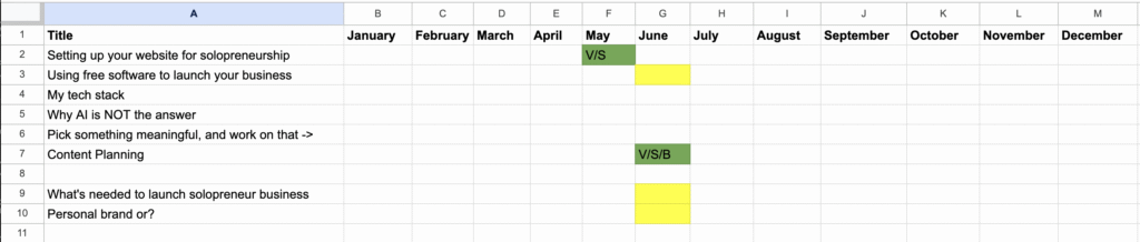 I use color-coded cells to indicate the month in which I’m either planning to, or have, posted the content. I use letters to indicate which channels I’ve posted to — V (for video), S (for social), and B (for Blog).